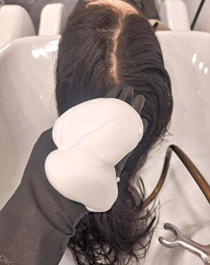 洗髪後、もちもち泡トリートメントを 髪全体に付けます。