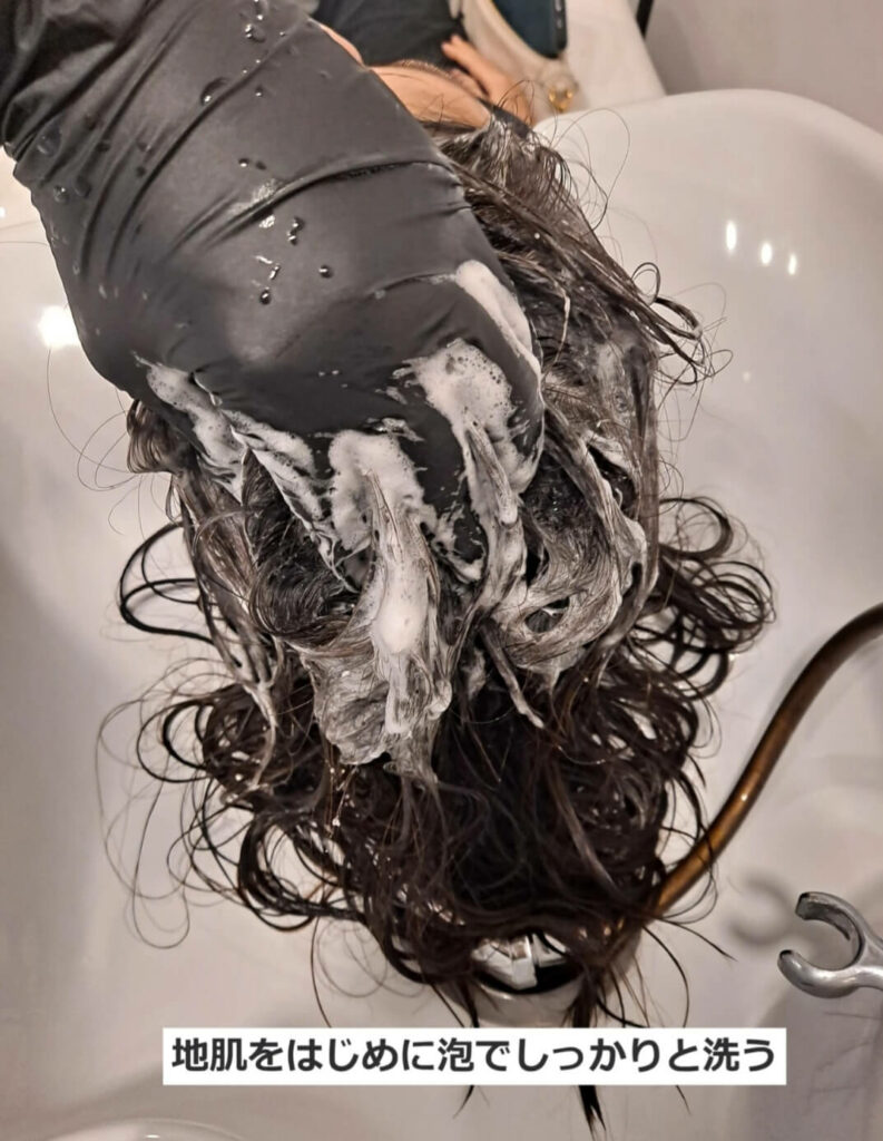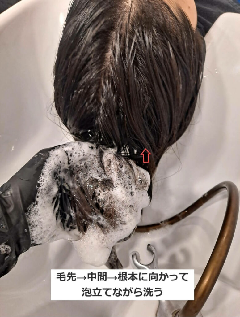 のシャンプー。中間、毛先を中心に全体に泡立てあげてください。この時根元にシャンプー剤がついても問題ありません。