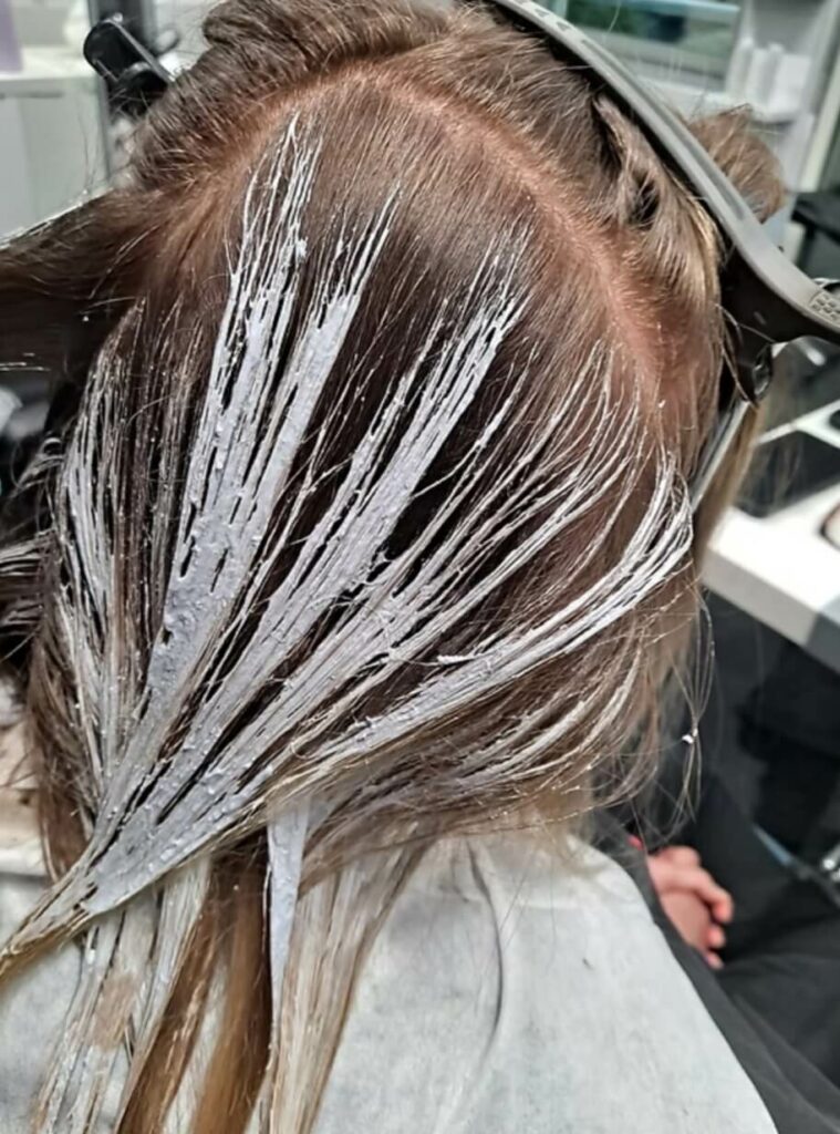 ほうきで履くようにハケを動かしながら、ぼかしながら自然にグラデーションに、ブリーチを髪に乗せるテクニックです。