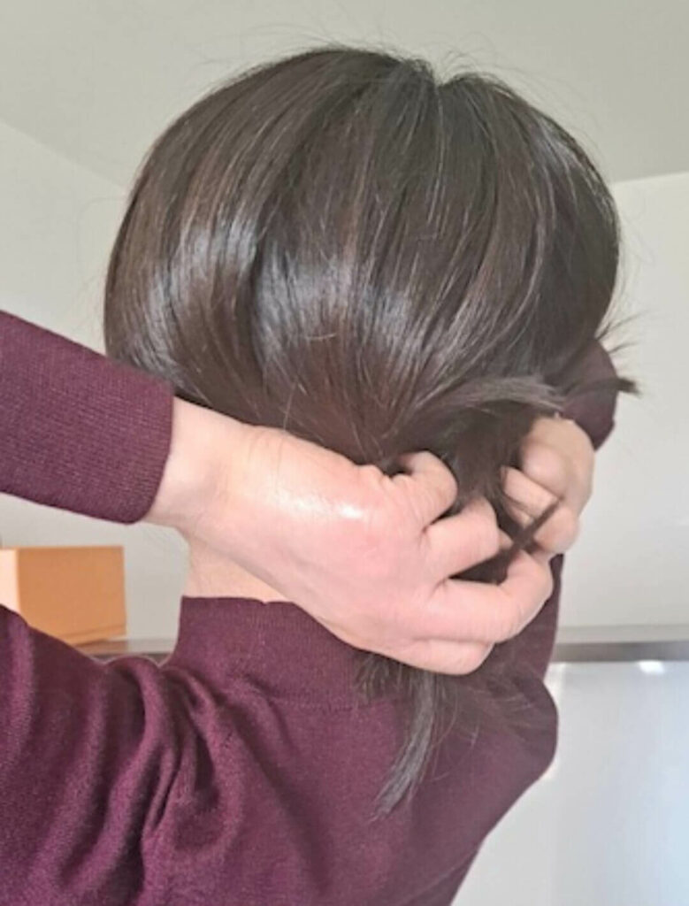 下から上に動かしながら髪を「手のひらですくうように」して「モミモミ」しながら流します。